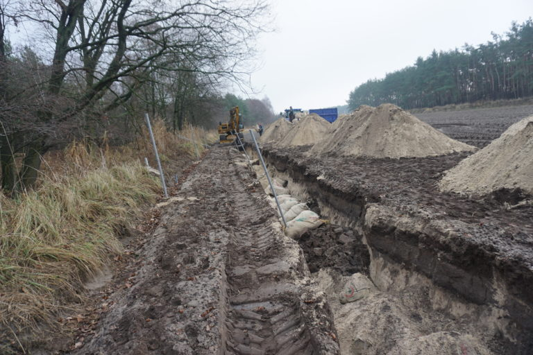Złoże dowolnej długości buduje się w pobliżu linii brzegowych jezior, zbiorników zaporowych, rzek lub cieków wodnych (Ryc. 3). Głębokość i szerokość złoża jest uzależniona od zakresu zmienności poziomu wód gruntowych. Wykorzystanie najłatwiejszych i najtańszych do pozyskania w danym regionie materiałów włóknistych zawierających węgiel organiczny, a także indywidualne dostosowanie proporcji wykorzystania tych materiałów w złożu na danym terenie pozwoli na uzyskanie efektywnej redukcji związków azotu. Do złoża zaaplikowana jest określona pula mikroorganizmów denitryfikacyjnych. Dodatek mikroorganizmów skutkuje podniesieniem efektywności procesów denitryfikacyjnych oraz umożliwia wydajne działanie złoża nawet w warunkach długotrwałej suszy.