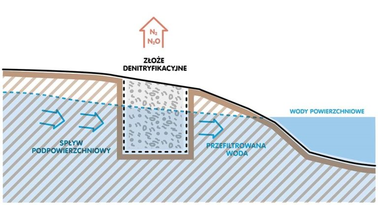 Metoda polega na wytworzeniu w pobliżu linii brzegowych ekosystemów wodnych złóż denitryfikacyjnych do redukcji zanieczyszczeń obszarowych. Złoże takie przygotowuje się prostopadle do kierunku przepływu zanieczyszczonych azotanami wód gruntowych, odpływających z obszarów użytkowanych rolniczo np. pola uprawne (Schemat 2). Aktywizują one proces denitryfikacji i redukują azotany do form gazowych (NO3 → N2).